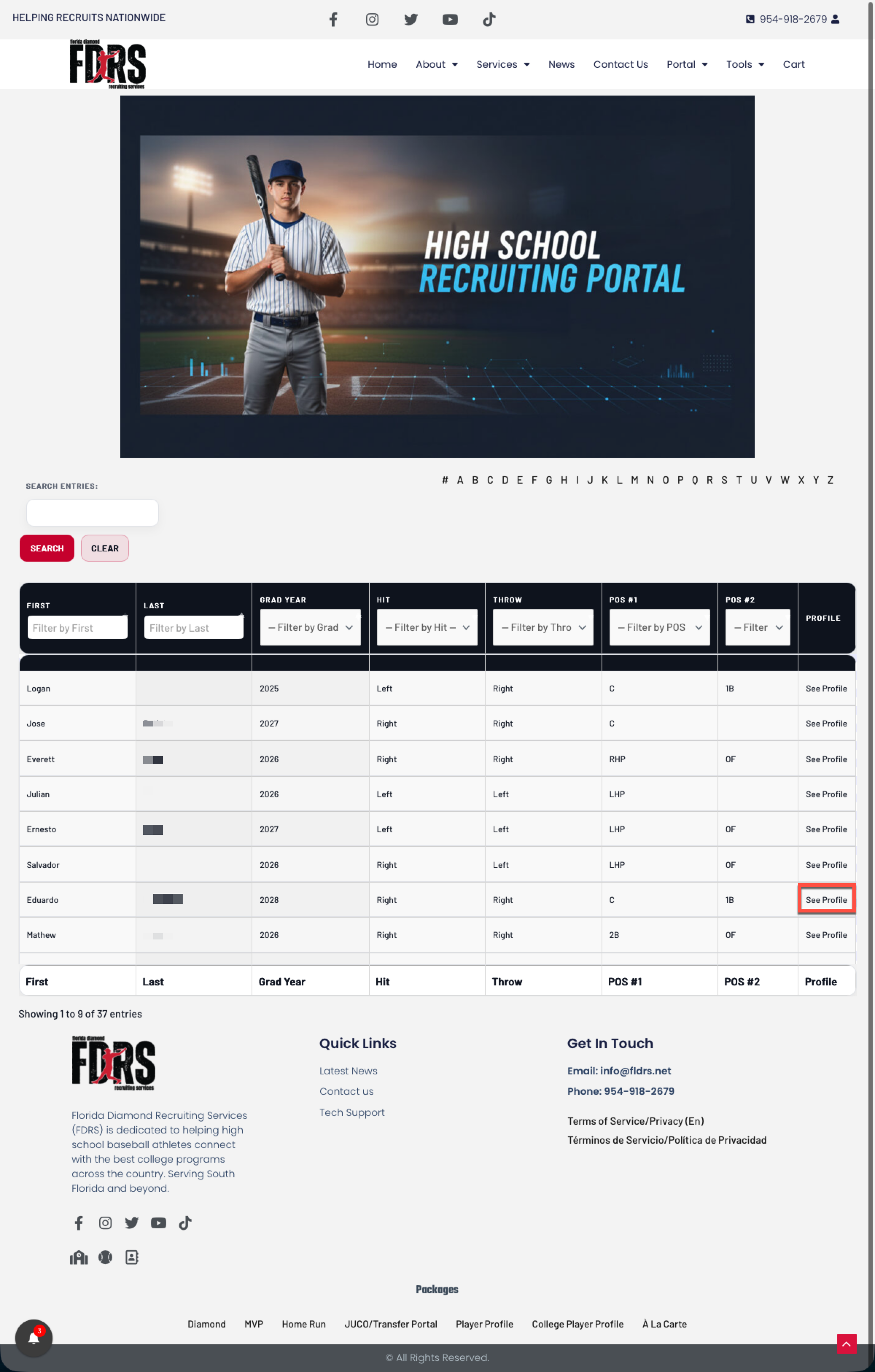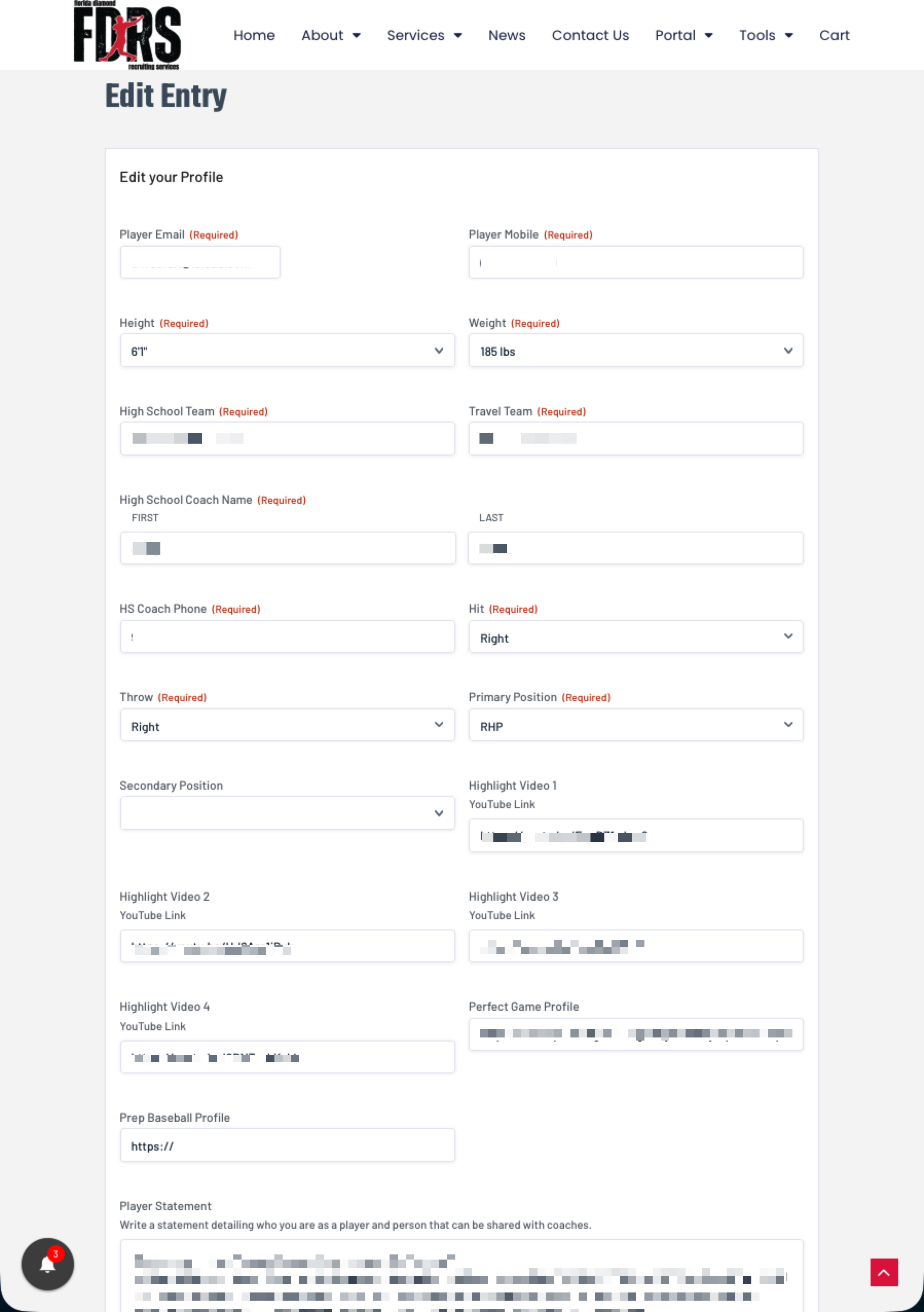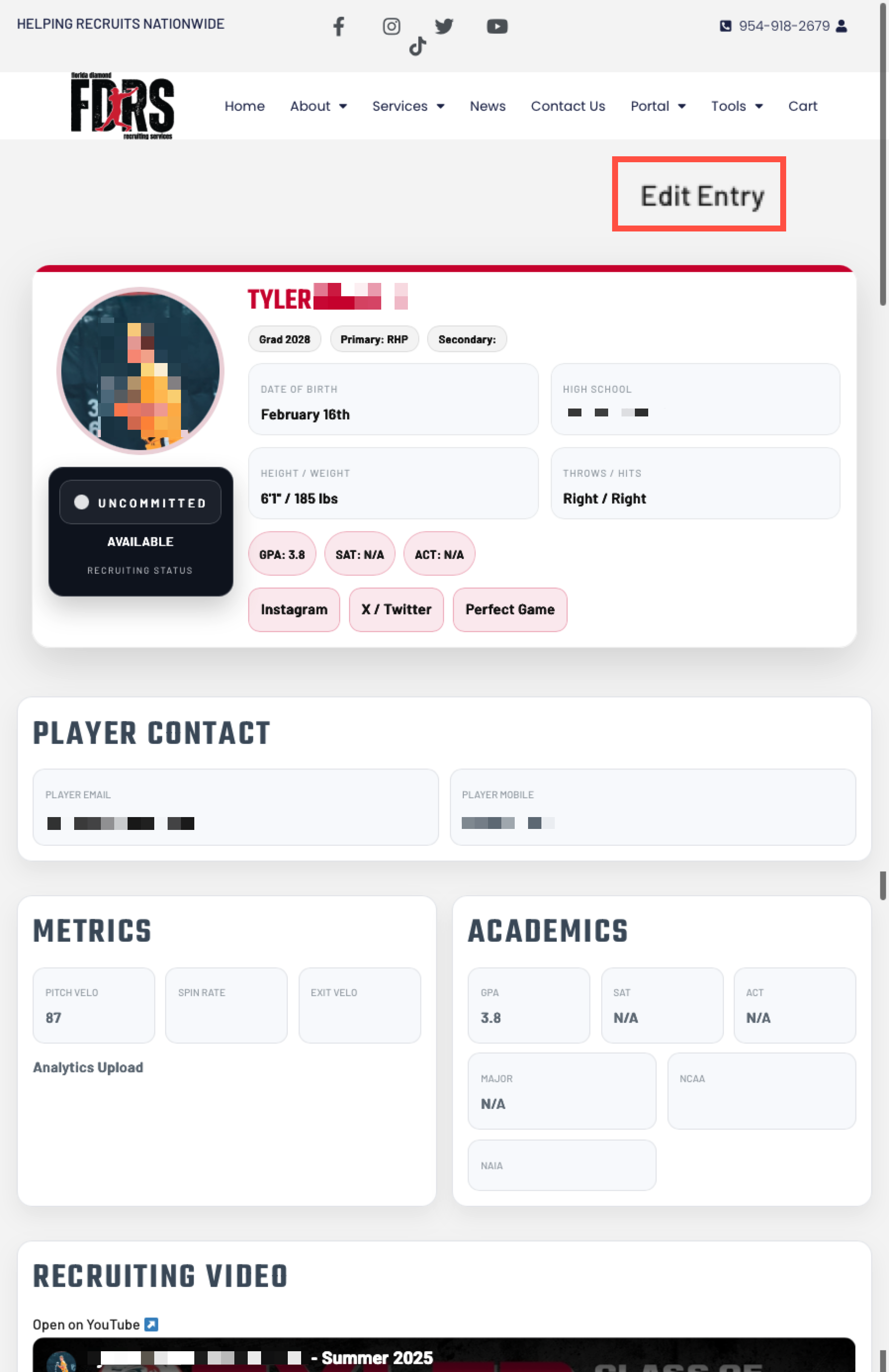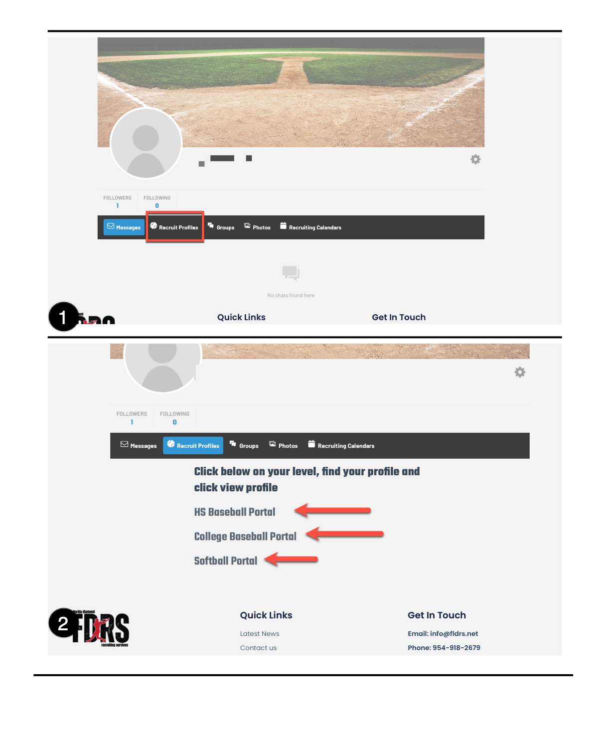 On the account page, click Recruit Profiles and you will be able to click on HS Baseball, College Baseball, or Softball.